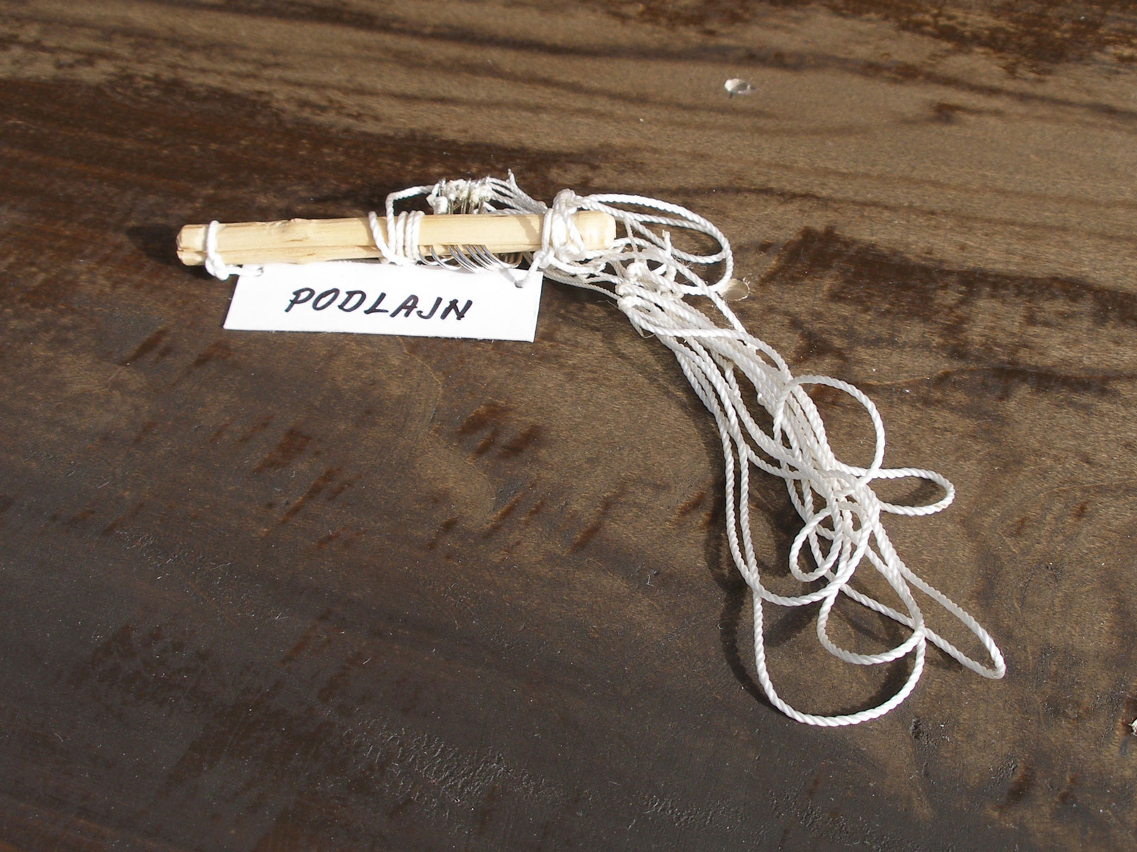 PODLAJN, štap od 1,5 m uz obalu, 7 – 10 udica (1,5 – 2 m jedna od druge) i kamen na kraju špage; koristi se u ljetnim mjesecima u lovu na soma;